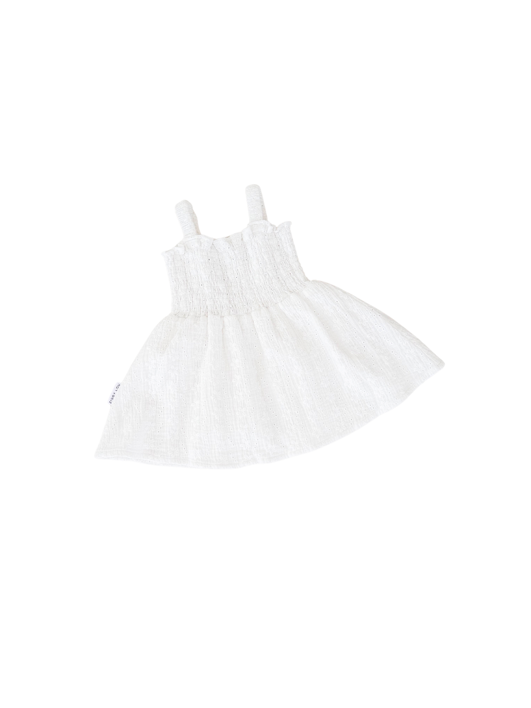 Cotton dress in our Laurel broderie anglaise fabric. Shirred bodice with adjustable button hole straps. Mix and match with items from our Christmas Collection.