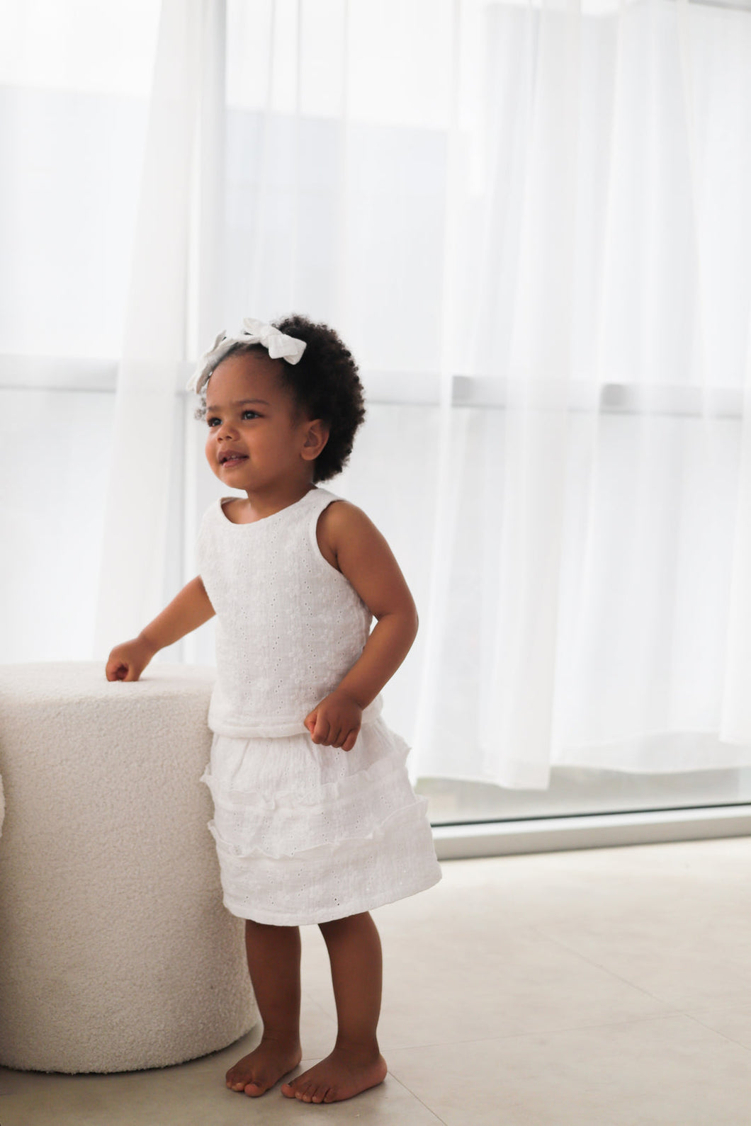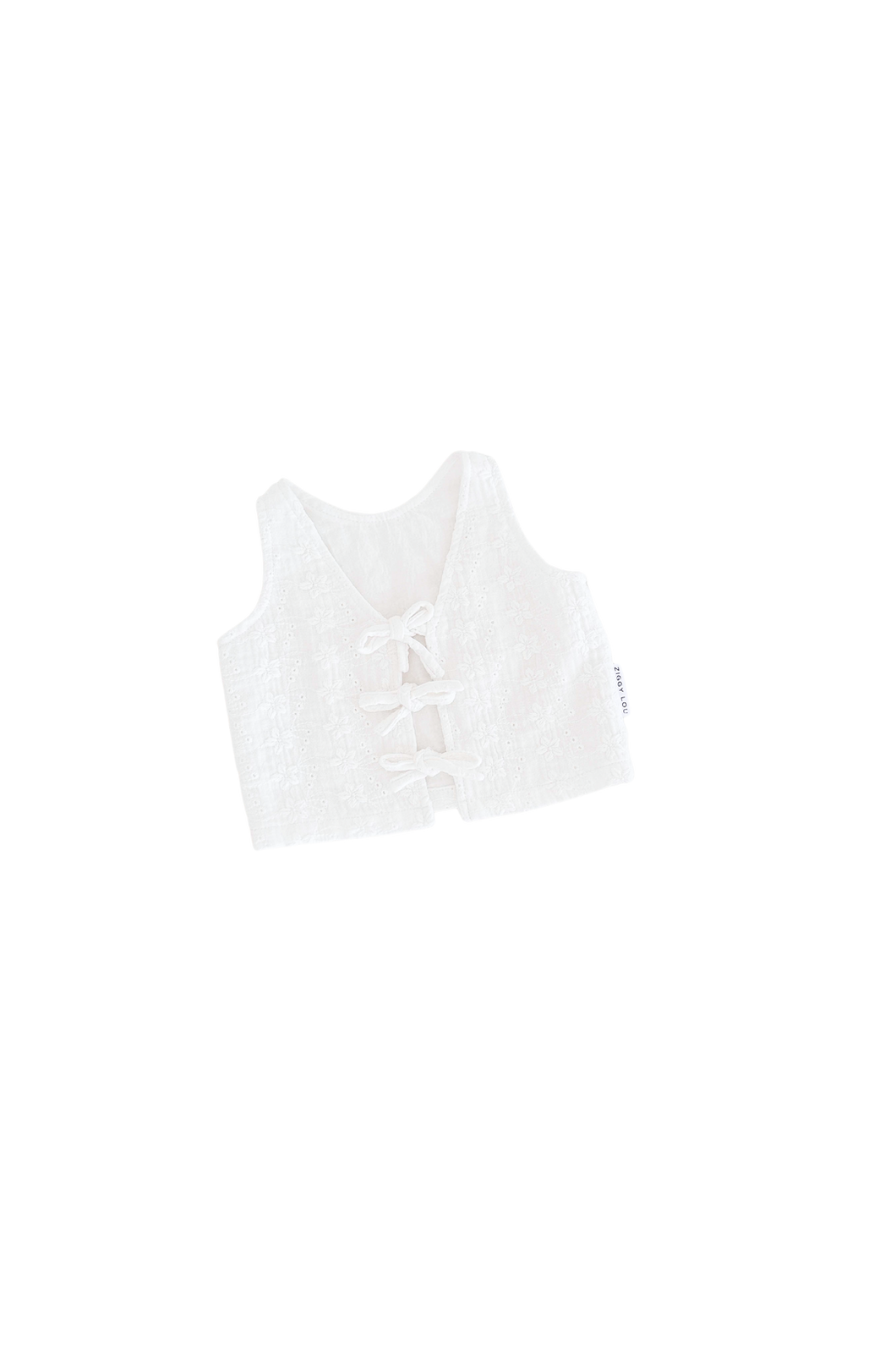 Cotton singlet in our Laurel broderie anglaise fabric. Functional ties down the middle, can be worn in reverse. Mix and match with items from our Christmas Collection.
